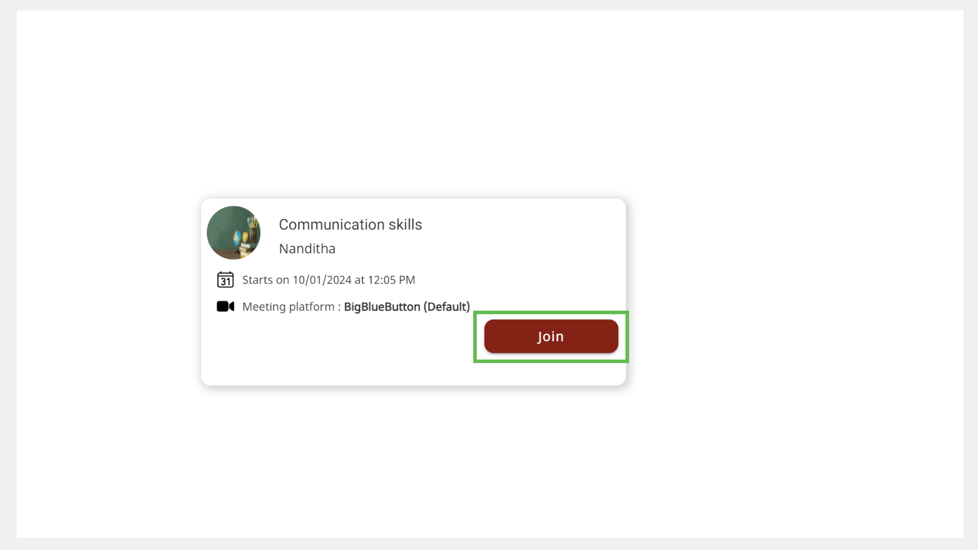 - If the meeting platform is BigBlueButton, click Join. The BigBlueButton window appears on your web browser.